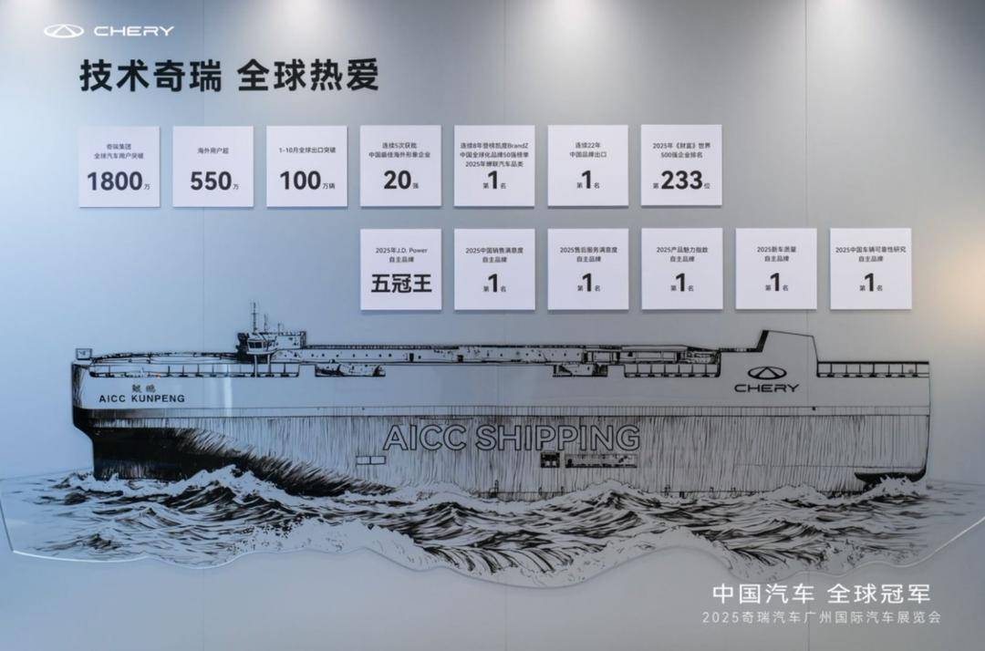 企业的发展速度,从来都镌刻着时代的印记。今年9月,奇瑞在港交所正式挂牌上市,开启了国际资本市场的新征程。而此次广州车展,作为全年最后一场A级车展,奇瑞用一份沉甸甸的"成绩单",回应了市场的期待。今年1-10月累计销售228.89万辆,同比增长13%;新能源汽车销量69.79万辆,同比激增73.1%,规模稳居行业前五;出口106万辆,成为最快达成年内出口百万辆的中国汽车集团,全球累计用户突破1800万,其中海外用户超556万。