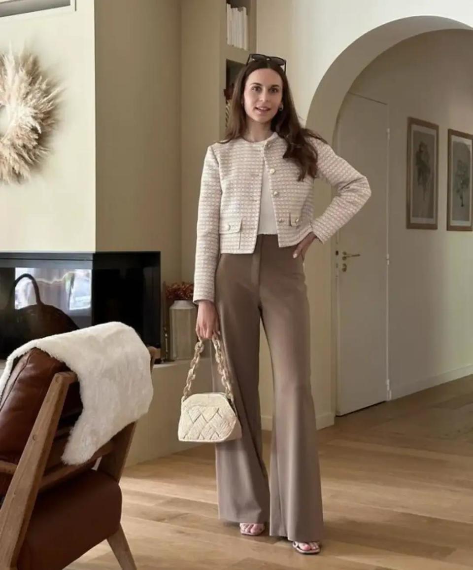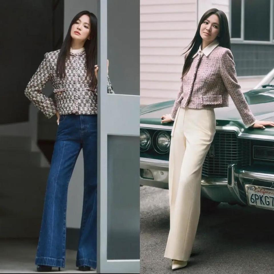 咱们就看下面这位女明星宋慧乔的穿搭,就是非常的精致,用一件格纹的小香风外套搭配上蓝色的牛仔阔腿裤,脚上穿的黑色的高跟鞋,或者是换一件翻领的小香风外套,搭配上白色的西装阔腿裤,脚上穿的白色的高跟鞋,这样的穿衣打扮,1套休闲精致,另一套给人的感觉精致又干练。