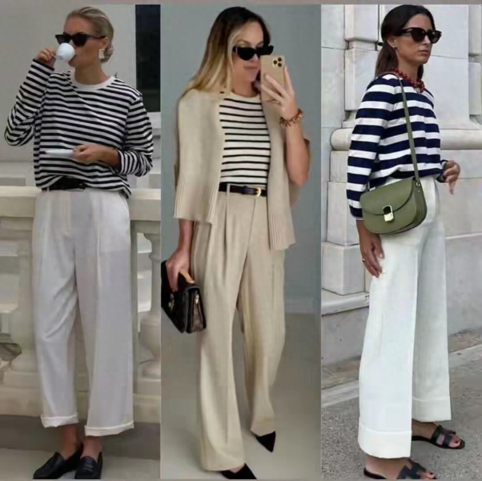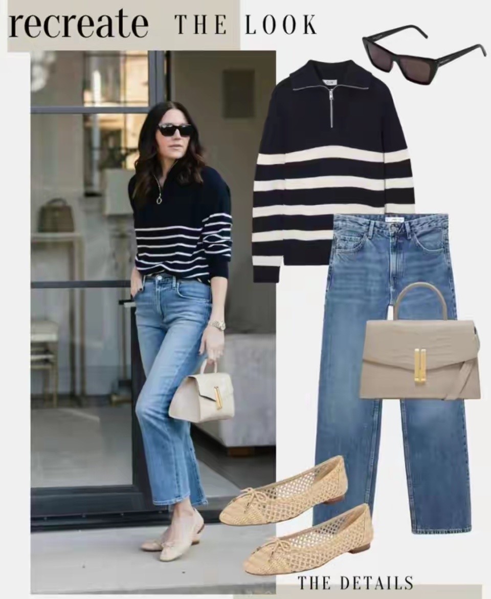 例如,下面这套穿搭就很不错,用一件黑白条纹的针织上衣,搭配上牛仔九分小阔腿裤,脚上穿的是一双镂空的低跟单鞋,这样的搭配简约大方。