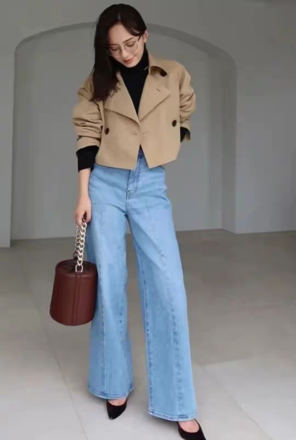 我们还可以采用上短下长的搭配方式,一件卡其色的西装外套,内搭黑色的针织衫,加上一条蓝色的牛仔阔腿裤,脚上穿了黑色的高跟鞋,这样的衣服搭配简便洋气,而且很精致,还能让穿搭者达到显高显瘦的效果,使得身材形成三七分的比例,这就是上短下长的搭配方法。