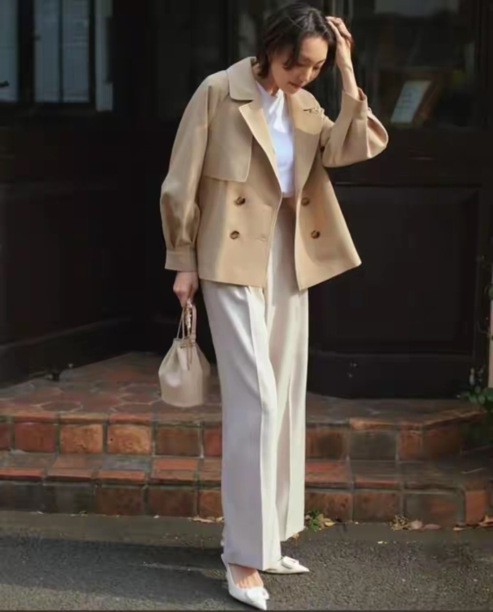 当然啦,你还可以选择像大衣一样的短款外套,想想名字已经卡其色的大翻领外套,内搭白T恤,加上一款白色的阔腿裤,加上穿了一双高跟鞋,结合上一款齐肩波波头短发,穿的时候把里面内搭的T恤一角塞进裤子里面,就能很好的提升腰线,不过衣服面料一样,要避免那种容易起毛起球起褶皱的款式,要不然穿在身上很难有这种品质。