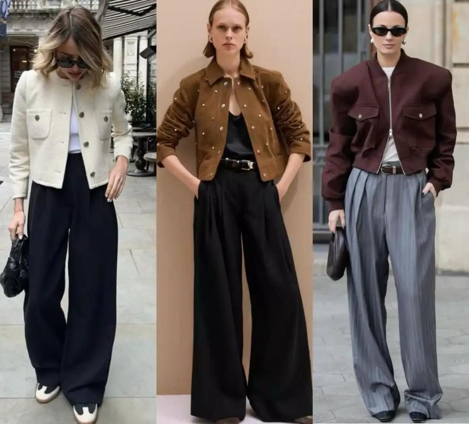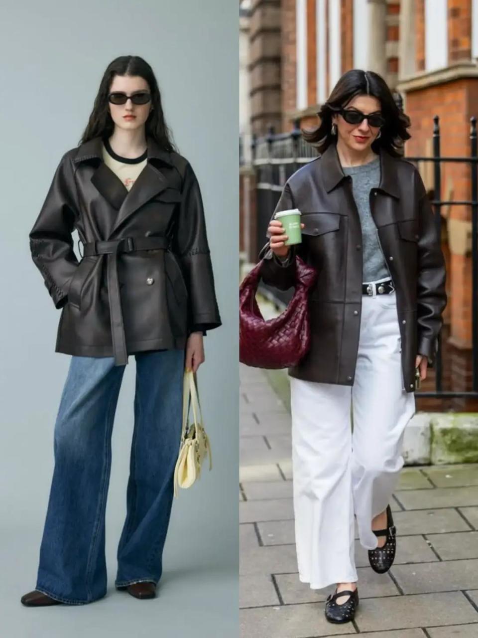 其实选择什么样的鞋子取决于你上半身穿的裤子,还有外套是什么样的款式?比如下面这件皮质的外套,搭配上牛仔阔腿裤和白色的阔腿裤,这时候我想让自己的造型变得又飒又美,那么我们可以选择皮材质或者是牛皮材质的乐福鞋,皮鞋,穆勒鞋,浅口单鞋,粗跟单鞋,这样的鞋子来搭配就能够提升整个造型的品质。