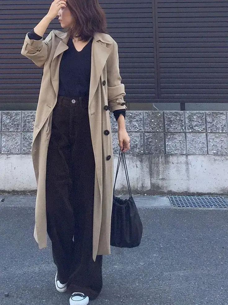 想让自己的穿衣打扮比较休闲点,还可以选择帆布鞋的搭配,例如下面用一双黑色的帆布鞋搭配上咖色的阔腿裤,外搭一件浅卡其色的风衣外套,里面再加一件V领的针织打底衫,这样的穿衣打扮,不管是日常休闲穿搭,出门约会,逛街或者上班穿搭,都没有任何问题,轻轻松松穿出时髦的造型来。