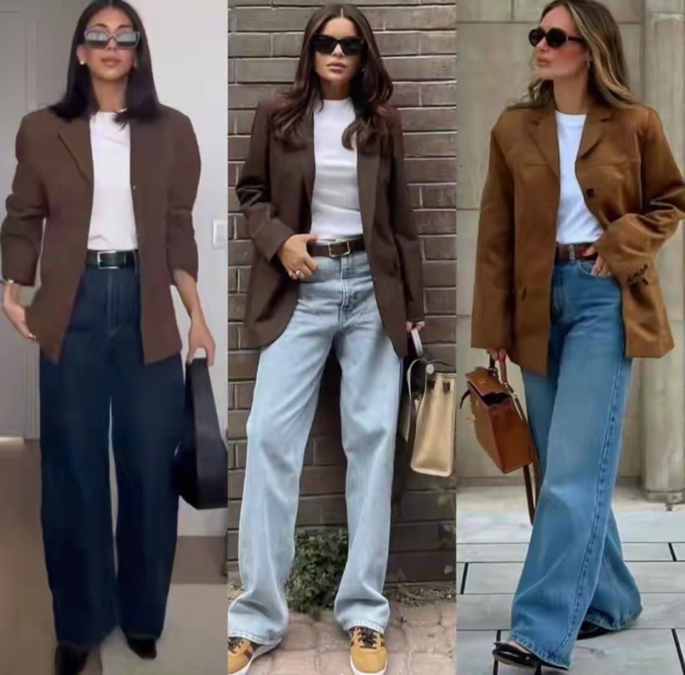 如果你是职场女性,其实蛮推荐大家选择西装外套的,下面这种咖色或者是棕色系的西装外套,内搭白色T恤和一条牛仔阔腿裤,就能穿出简约干练的造型,穿去上班再适合不过了。