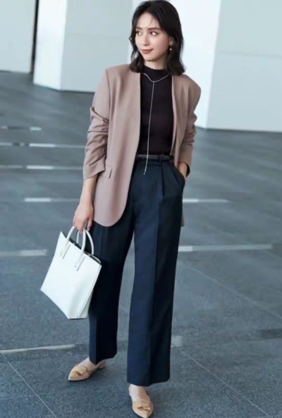 如果你身材凹凸有致,这时候你可以选择下面这种黑色的针织打底衫作为内搭,再加上一款西服外套,下半身选择黑色的直筒阔腿裤,脚上穿了一双穆勒鞋,这样的穿搭非常适合咱们职场女性,内搭的衣服面料轻薄,穿在身上透气性比较好,非常符合现在的秋季。